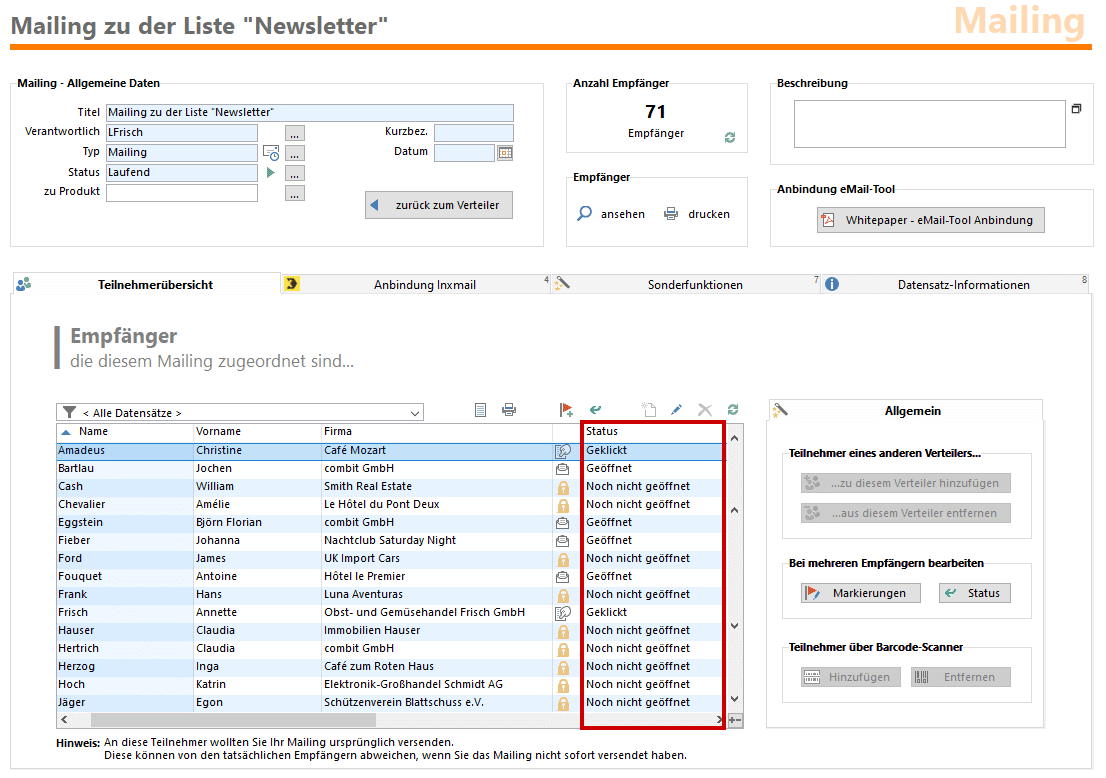 Mit combit CRM versenden Sie personalisierte Mailings direkt aus Ihrer Kontaktmanagement-Software. Ob Newsletter, Serienmail oder Event-Einladung – Ihre Kampagnen erreichen die richtigen Zielgruppen zur richtigen Zeit. Die Anbindung an Tools wie Mailchimp, Inxmail, CleverReach oder Brevo sorgt für höchste Flexibilität.